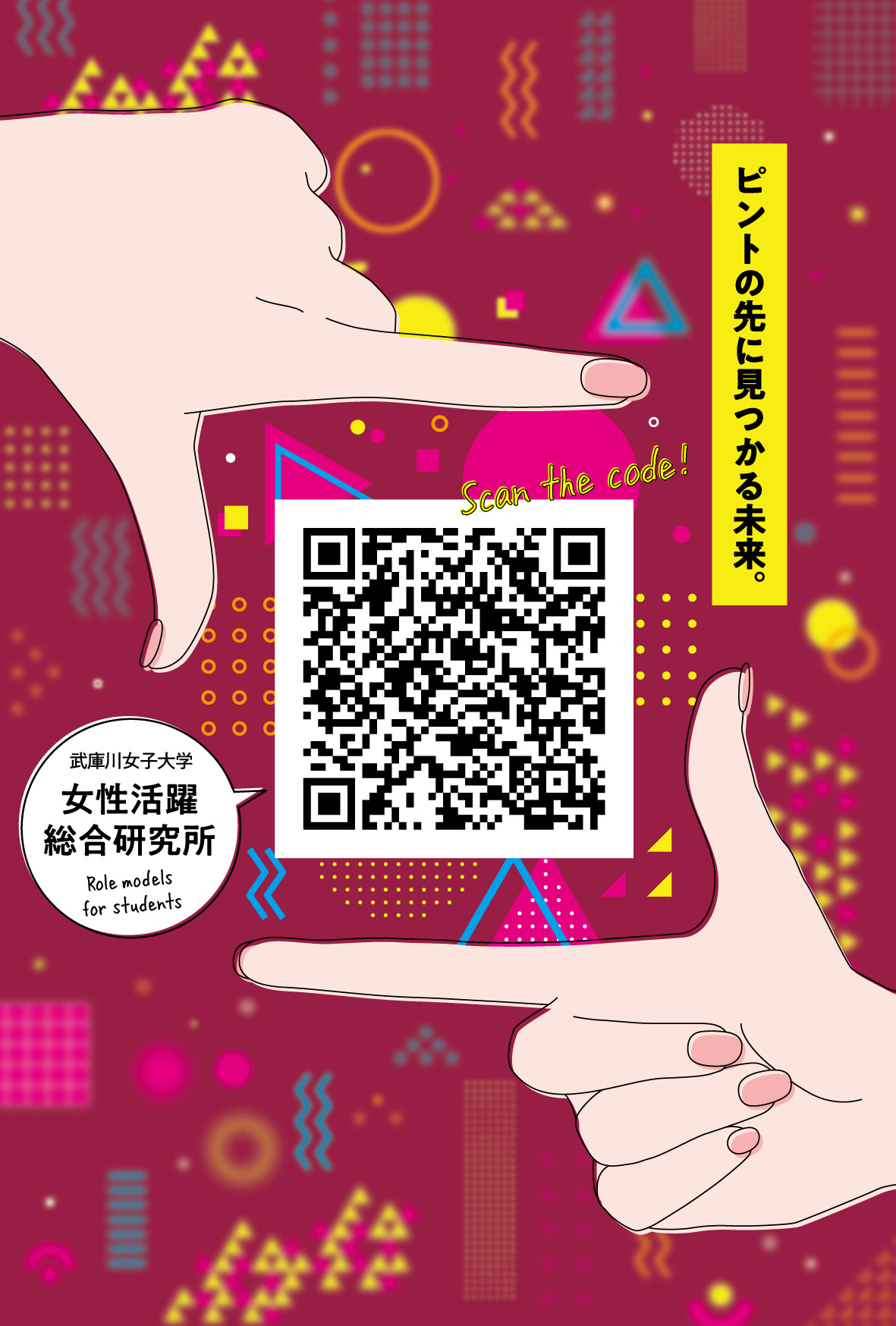 武庫女の先輩達が作った実績を見て自分の未来のヒントを探そうをコンセプトにビジュアル作成。手カメラの先だけピントが合っている見せ方にしてコピーと連動させ表現しました。周りのオブジェクトは様々な想いを抽象的に図形で表現しています。ロールモデルの情報はWebサイトに多数掲載しているのでQRを大きく扱い流入させるべく構成しています。