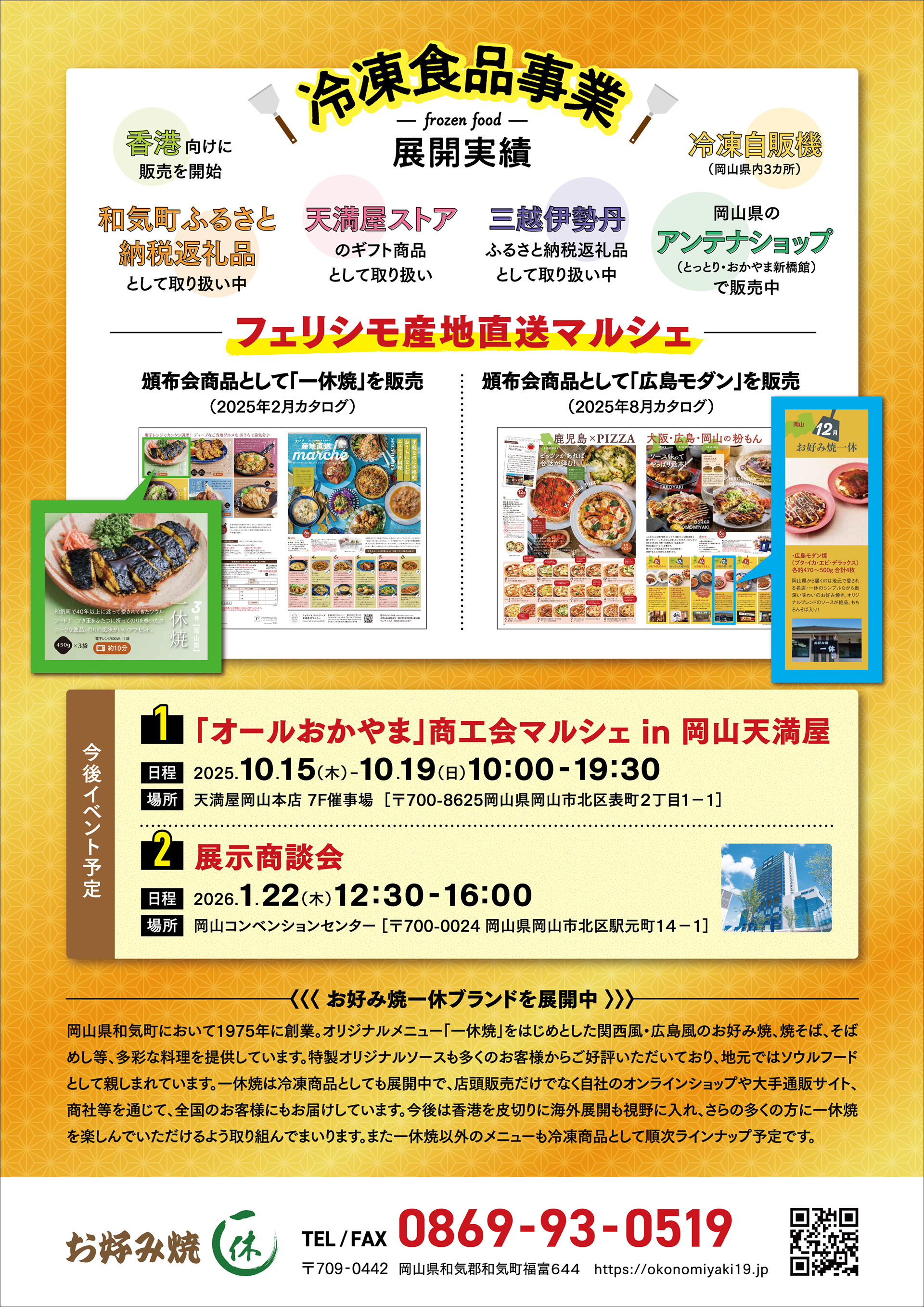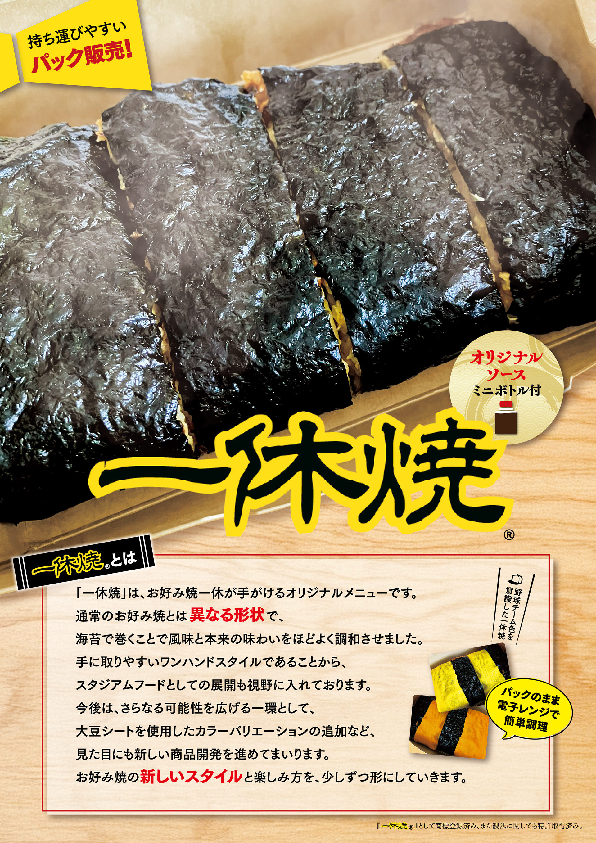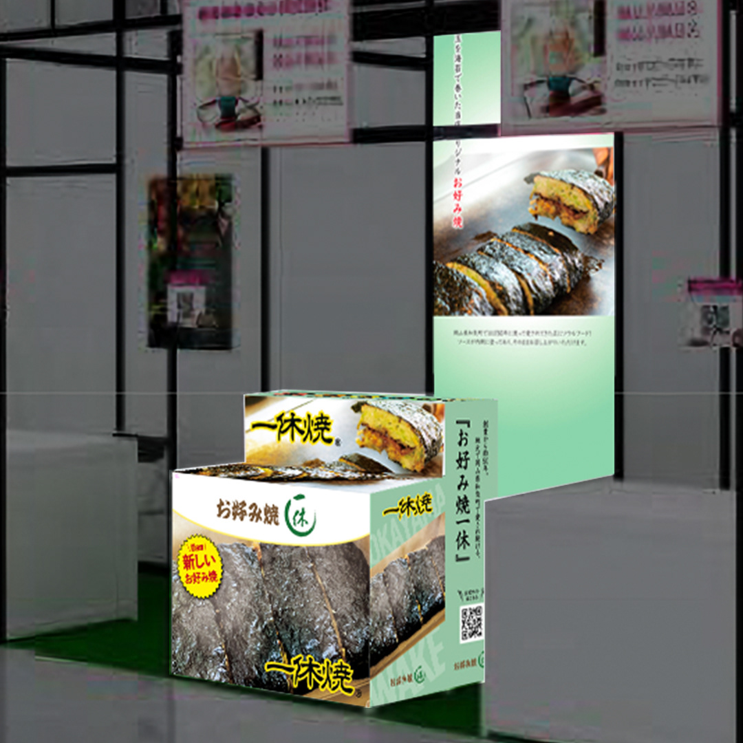 イベント時のブランド認知を高めることを目的としたフライヤー・店頭什器を制作。既存の一休焼から改良された新仕様 ― 大豆シートによる色バリエーションの展開、個数調整による手軽さ、ワンハンドで楽しめるスタイル ― を中心に訴求し、新しい一休焼の魅力を印象的に伝える構成としています。また、著名メディアでの掲載実績など、消費者の目を引く情報を効果的に盛り込み、興味喚起と購買意欲の向上を意識したデザイン。店頭什器はブランドカラーであるグリーンを基調に展開し、一休焼らしい温かみと世界観を表現。イメージカットを大きく取り入れることで、商品への期待感と臨場感を演出しています。